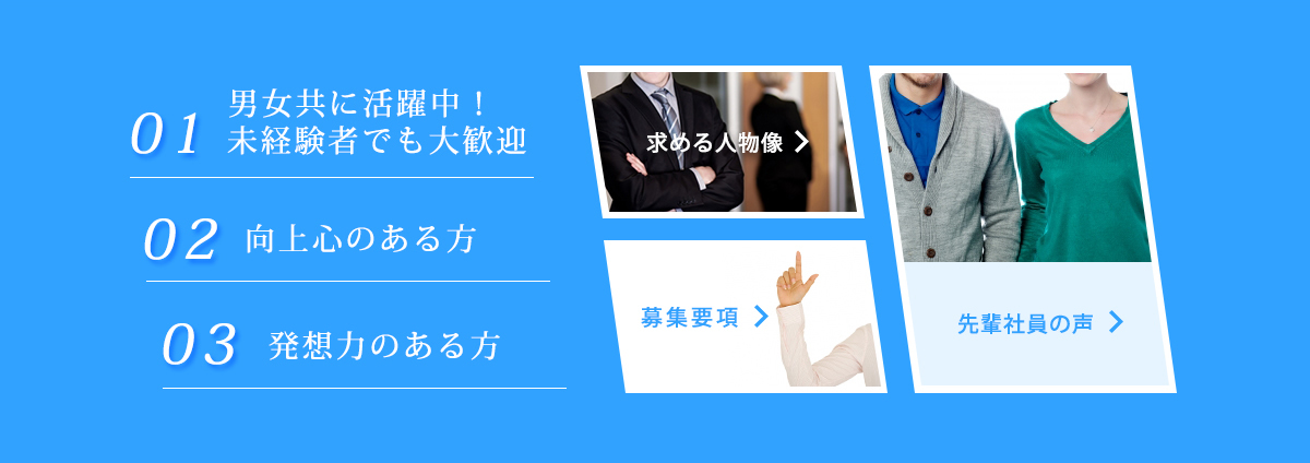 | 仕事内容 | ・通販向け組立収納家具の企画、プレゼン等の業務 ・ネット通販のホームページ企画 ・受注管理、営業事務全般、ネット業務(ネット通販掲載の商品撮影、加工等) ※パソコン知識のある方優遇 |